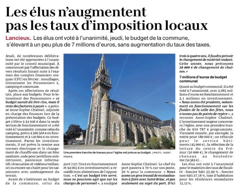 Lancieux - A l'unanimité, les élus votent le budget et n'augmentent pas les taux d'imposition locaux.