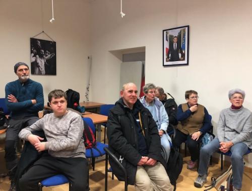 Théo a été accueilli à la mairie accompagné de marcheurs venus pour la plupart de l'ESAT de Dinan : encadrants et personnes handicapées habilitées à travailler à l'extérieur pour, entre autres, des travaux d'entretien de jardin et de petite maçonnerie dans les collectivités et chez les particuliers. (Contact ESAT Dinan : 02 96 87 33 33)
